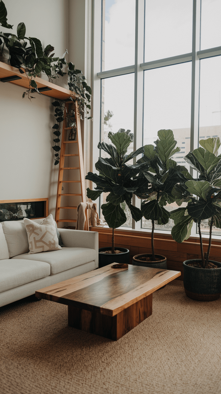 Skylights and large glass doors provide excellent light sources often overlooked in placement strategies. A fiddle positioned beneath a skylight receives substantial overhead light that more closely mimics its natural forest environment where light filters down through canopy gaps.