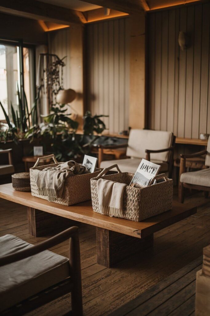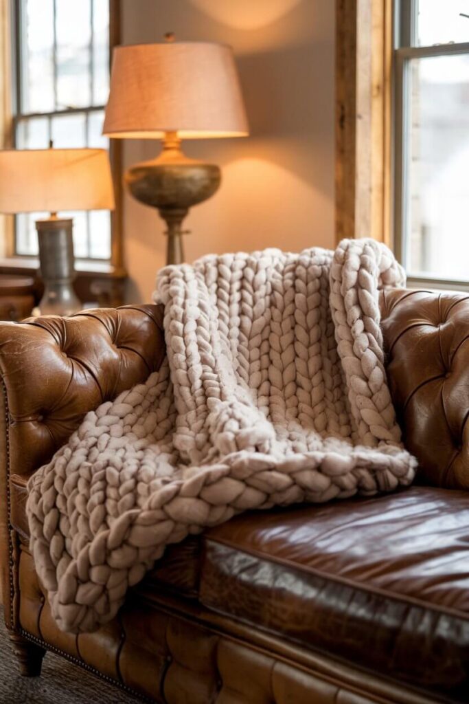 Oversized knit blankets draped over sofas or chairs invite touch while adding cozy visual weight. Look for irregular stitches, natural fiber content, and colors that complement your wood tones.