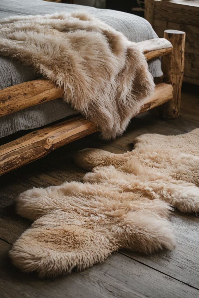 Natural animal hides draped over chairs or placed as bedside rugs introduce luxury texture with organic shapes. Their soft, irregular forms contrast beautifully with geometric furniture lines.