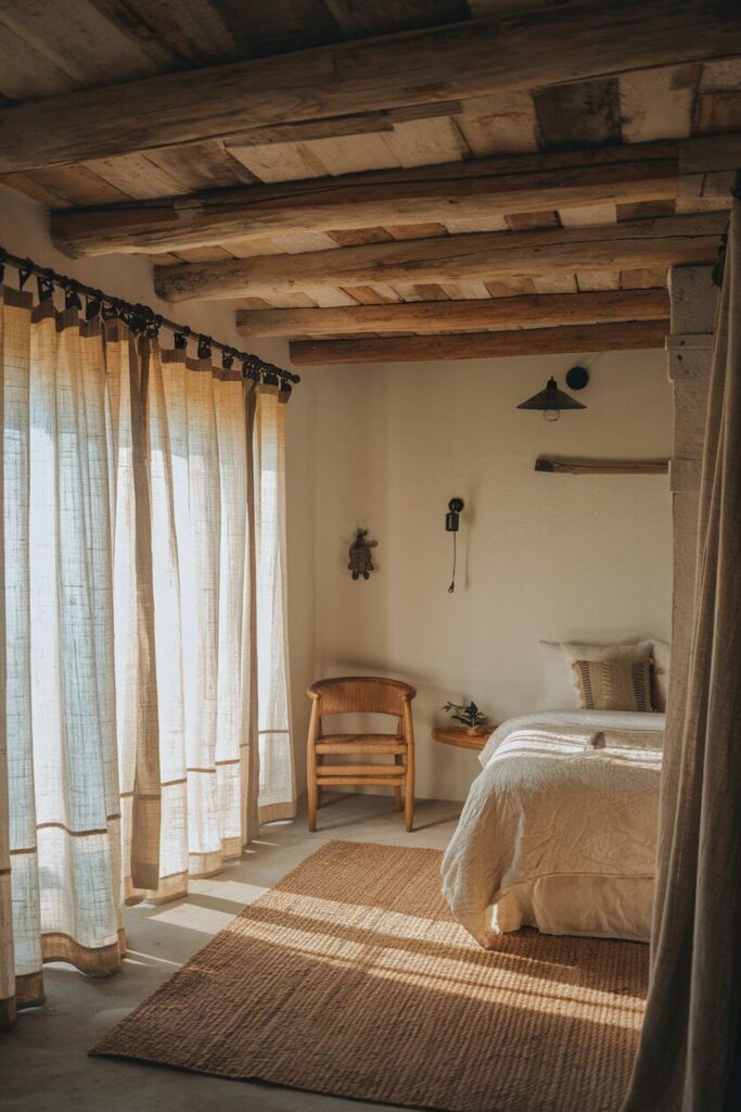 Natural linen curtains soften harsh sunlight while maintaining the relaxed, lived-in feel essential to rustic charm. Their natural wrinkles and irregular weave patterns add movement and visual interest.