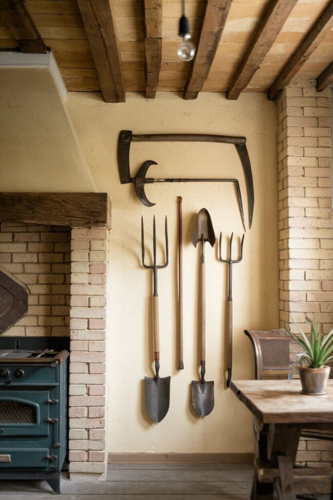 Arrangement technique: Create gallery walls mixing tools of different sizes and functions, unified by similar patina or wear patterns.