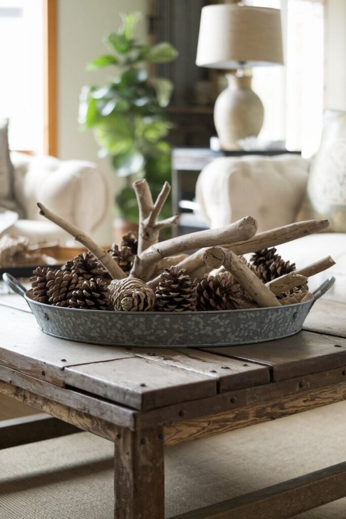 Pinecones, interesting stones, driftwood pieces, or preserved botanicals bring outdoor beauty inside while creating seasonal flexibility. Display in wooden bowls, galvanized trays, or simple glass containers.