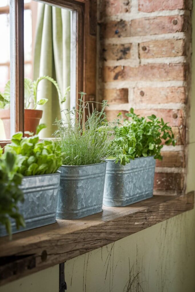 Fresh herbs in rustic containers serve dual purposes: practical cooking ingredients and natural decoration. Basil, rosemary, thyme, and sage thrive indoors while providing fragrance and visual appeal.