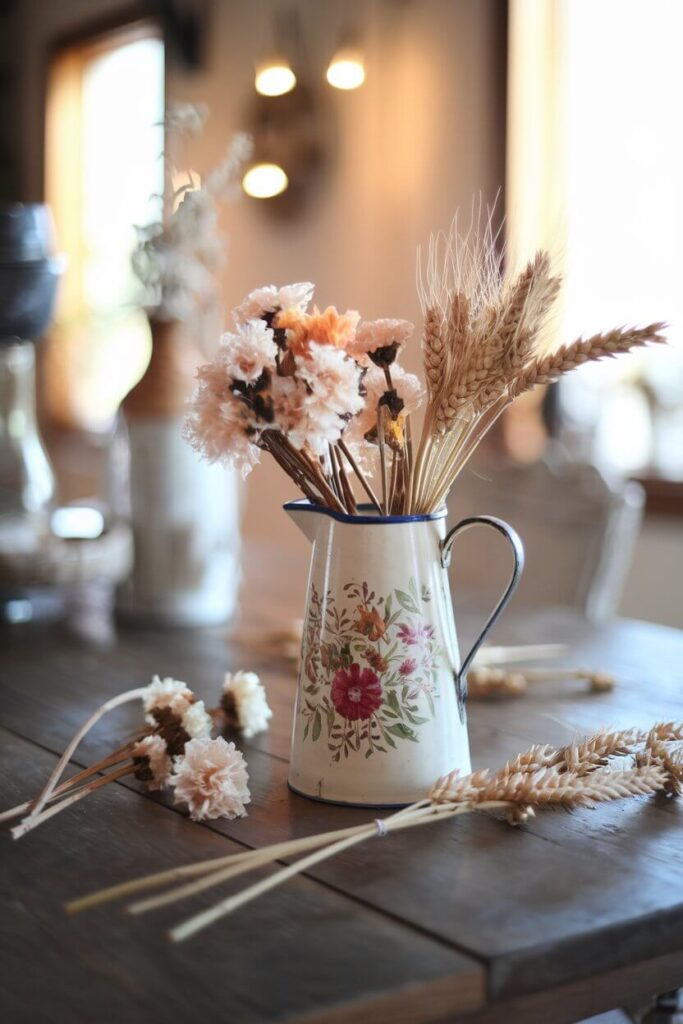 Preserved botanicals maintain beauty year-round without the maintenance requirements of fresh flowers. Wheat bundles, dried hydrangeas, or preserved eucalyptus create texture and natural color.