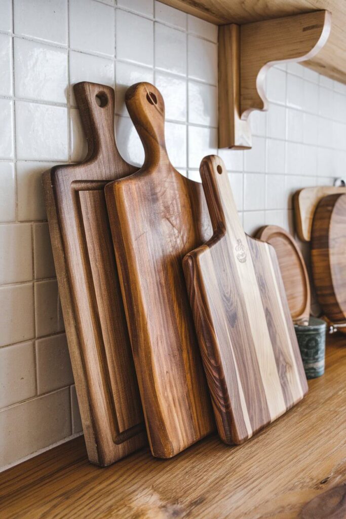 Beautiful wood grain patterns and honest wear marks make vintage cutting boards perfect for kitchen or dining room display. Lean against backsplashes or hang on walls for functional art.