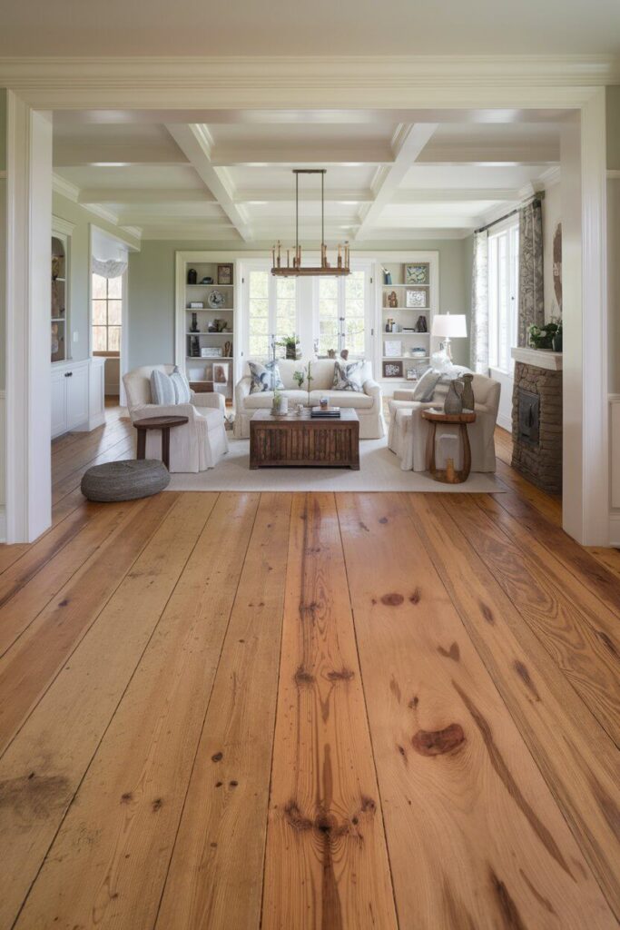 Traditional narrow strips feel formal and modern. Wide planks—especially those showing natural knots, grain variations, and slightly irregular edges—immediately shift the room toward rustic territory. Hand-scraped or wire-brushed finishes enhance the authentic feel.