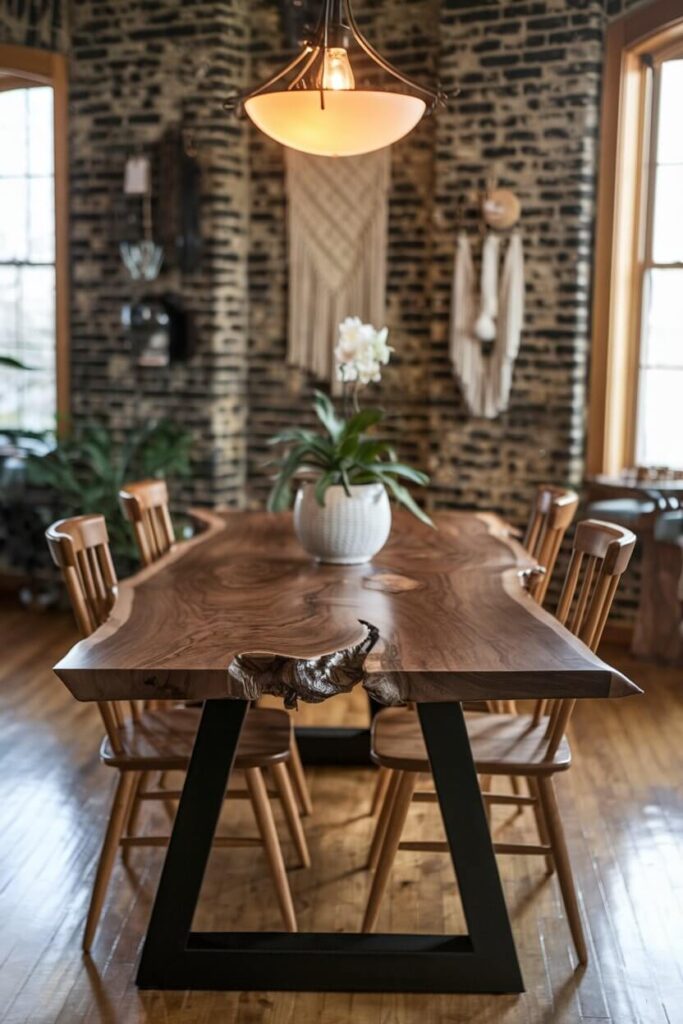 Whether it’s a dining table, coffee table, or console, live-edge pieces showcase nature’s artistry. The irregular bark edge preserved on one or both sides creates organic lines that soften geometric room layouts.